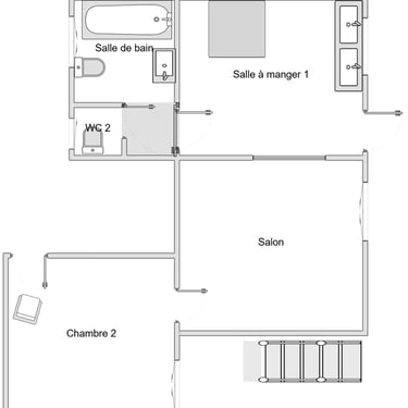 Option 2 : Restructuration en deux logements. La maison était initialement divisée en deux appartements distincts avec compteurs et accès extérieurs séparés. Il est possible de conserver cette configuration pour un projet locatif.